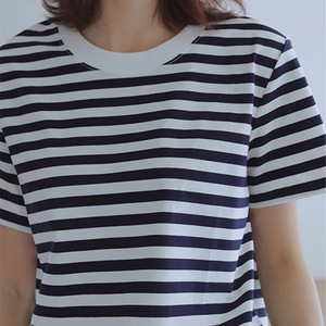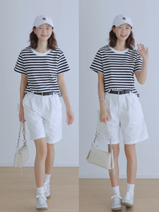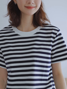 休闲宽松经典条纹圆领t恤女短袖正肩简约通勤浅蓝色叠穿纯棉上衣