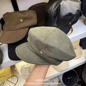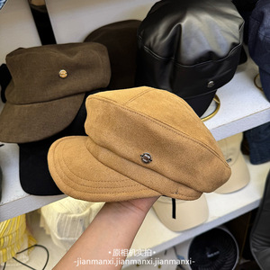 麂皮绒八角帽子女秋冬新款小字母圆标装饰韩版显脸小报童帽画家帽