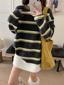 2025秋冬新款韩系简约条纹兔毛绒软糯加厚长袖T恤女宽松休闲上衣