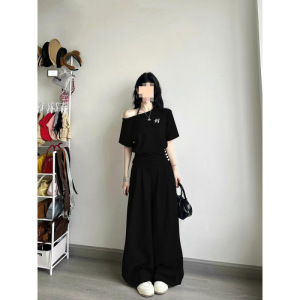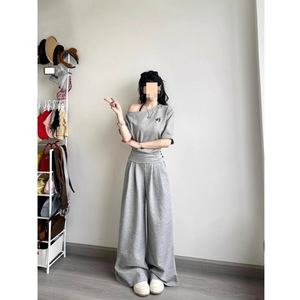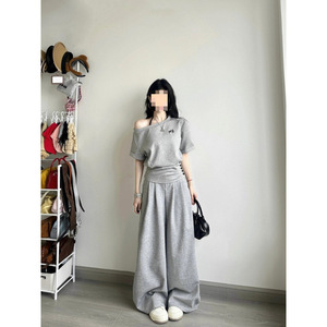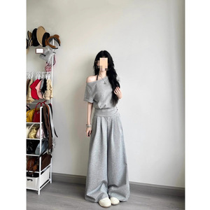 盐系少女感休闲运动套装女夏季灰色一字肩收腰短袖阔腿裤两件套