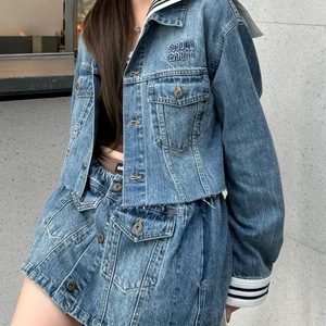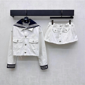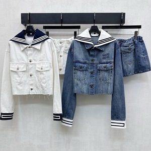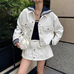 深圳南油高端女装2025秋季学院风条纹海军领牛仔外套+半身裙套装