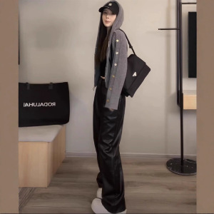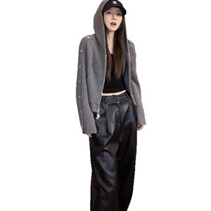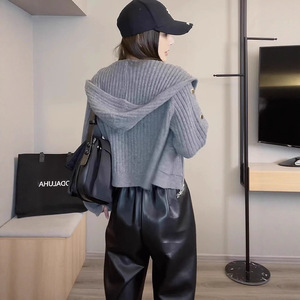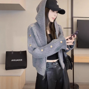 百搭双拉链连帽短款针织开衫女新款小众时尚休闲慵懒毛衣外套上衣