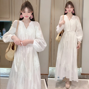 法式高级感绣花天丝长袖连衣裙2025春秋宽松慵懒风绝美纱裙长裙