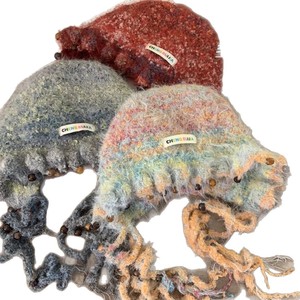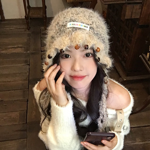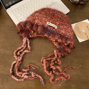 复古甜美手工编织彩色珠针织帽子女秋冬百搭流苏显脸小护耳毛线帽