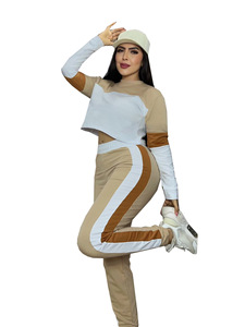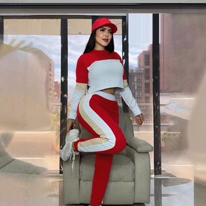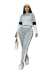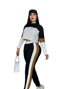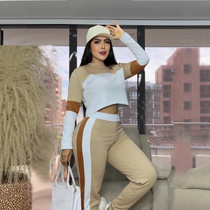 TW776跨境欧美时尚街头撞色拼接长袖套头衫女运动休闲长裤两件套