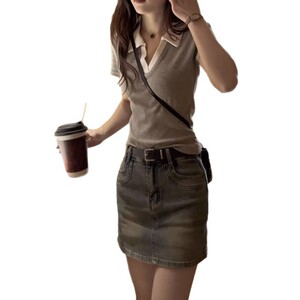 polo领短袖灰色拼接撞色修身显瘦正肩上衣夏季通勤时尚小个子T恤