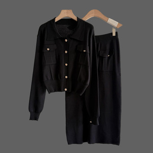 跨境法式翻领小香风套装秋冬毛衣女开衫上衣针织修身半身裙两件套