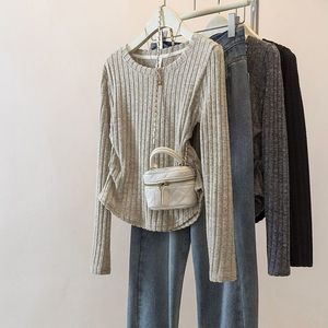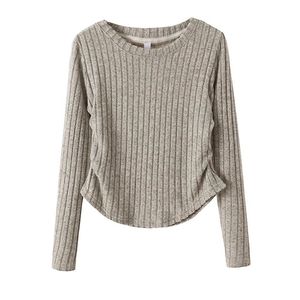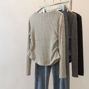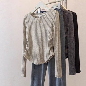 大码坑条褶皱长袖针织T恤女秋冬季2025新款韩版减龄独特正肩上衣