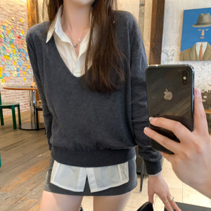 宽松慵懒风灰色V领长袖针织衫女2025新款春秋季轻薄气质显瘦上衣