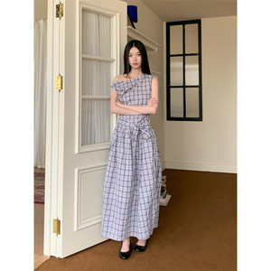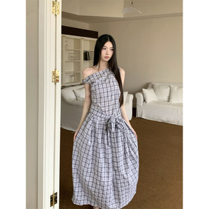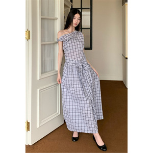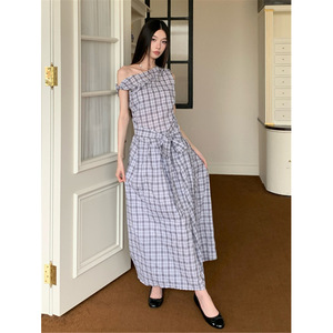 现货 秋新款斜肩一字领扭结不对称长款格子廓形连衣裙