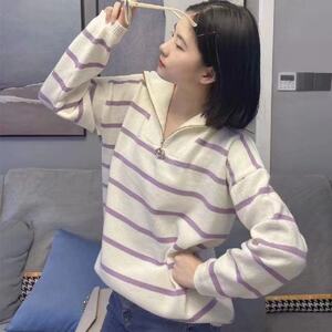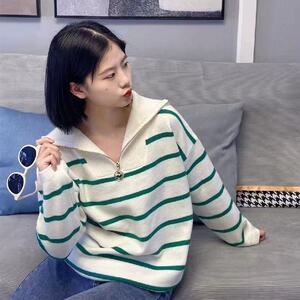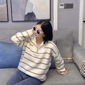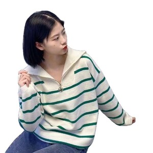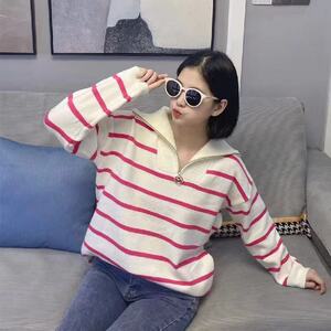 跨境外贸欧美亚马逊速卖通半拉链翻领撞色宽松大码条纹针织衫外套
