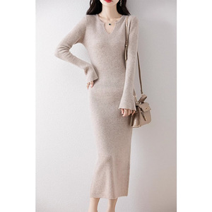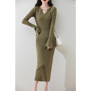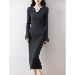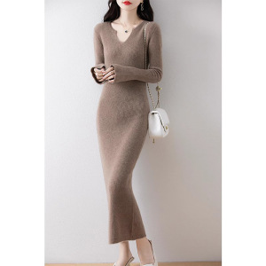 秋冬季气质v领修身纯色针织连衣裙女打底裙包芯纱毛衣裙包臀长裙