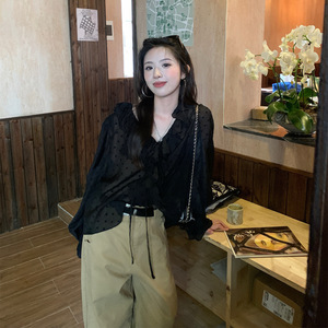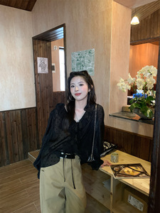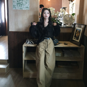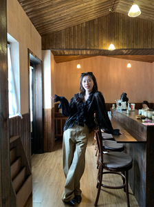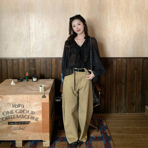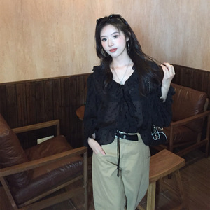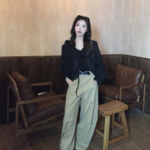 适美2025秋季时尚套装黑色系带长袖衬衫女高腰显瘦休闲长裤两件套