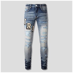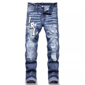 AM外贸跨境潮牌高街青年刺绣徽章破洞牛仔裤弹力紧身小直脚长裤子