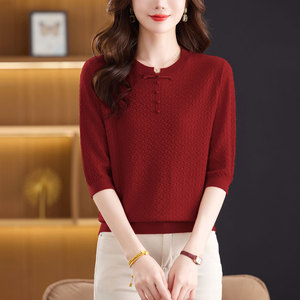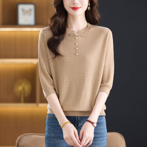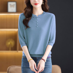 【厂家直供】初秋新款天丝提花七分袖针织T恤上衣宽松减龄冰丝衫