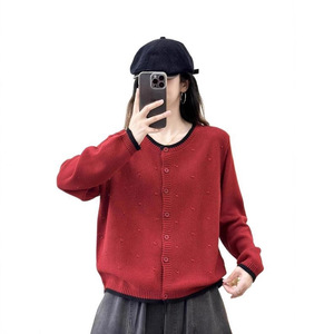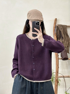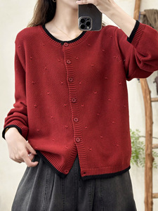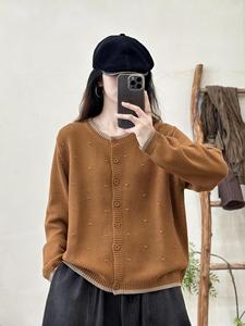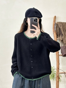 拼色针织开衫 2025秋季新款 复古宽松休闲上衣女长袖圆领毛衣外套