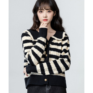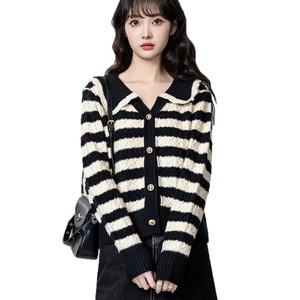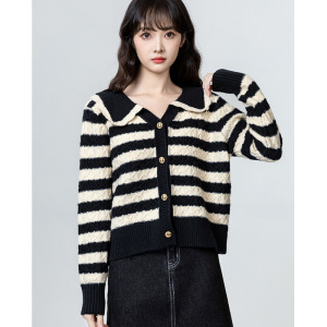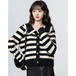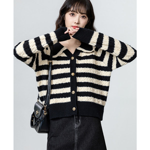 小香风娃娃领条纹毛衣开衫女春秋新款宽松显瘦百搭针织衫外套上衣