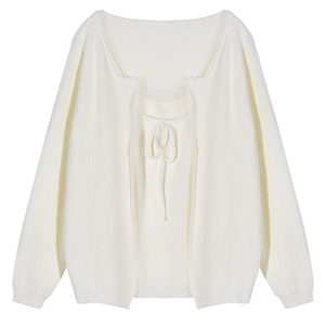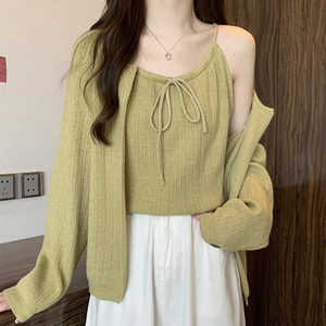 大码胖mm显瘦遮肉针织薄款开衫套装女秋装内搭无袖吊带背心两件套