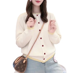 韩版高级灰拼接圆领针织开衫女早秋新款撞色氛围感刺绣毛衣外套