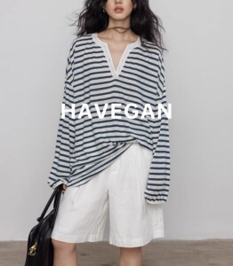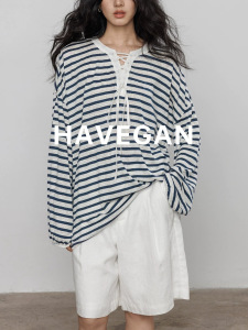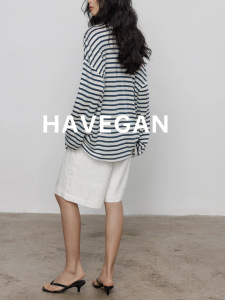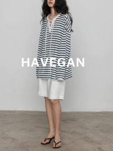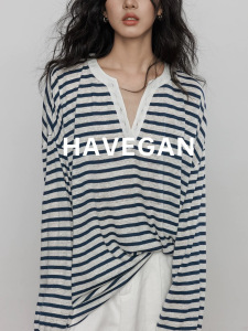 与间HAVEGAN/设计感v领亚麻条纹长袖T恤女秋季防晒薄款度假风上衣