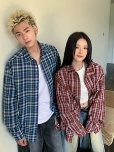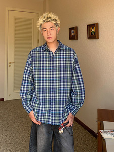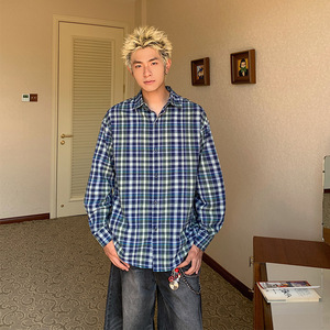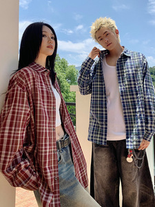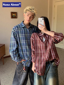 NASA美式复古棉质格纹长袖衬衫春秋季新款宽松休闲情侣款衬衣外套