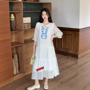 秋季中长袖刺绣法式复古感民族风式茶歇式裙子丝麻连衣裙