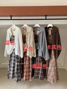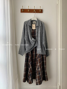 W家 原创翻领镂空针织开衫2025秋新款格子套装女甜美吊带裙两件套