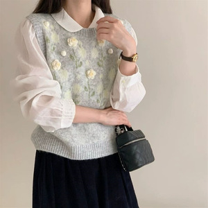 秋冬新款韩系甜美立体钩花针织马甲女宽松慵懒叠穿减龄毛衣背心潮