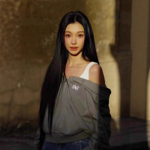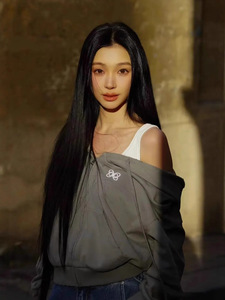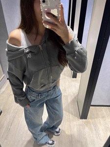 明星同款2025秋冬新款logo刺绣做旧假两件露肩开衫连帽卫衣外套女