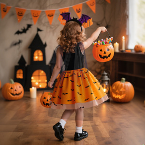 欧美万圣节蝙蝠女巫连衣裙女童拖尾网纱巫师 cosplay角色扮演服装