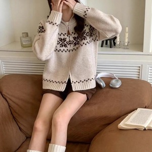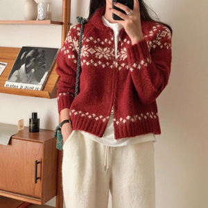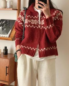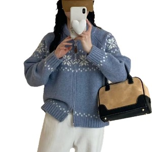 复古费尔岛撞色提花毛衣女秋冬新款慵懒风宽松双拉链针织开衫外套