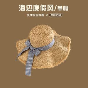 度假风海边沙滩草帽女夏季蝴蝶结大帽檐遮阳防紫外线百搭渔夫帽子