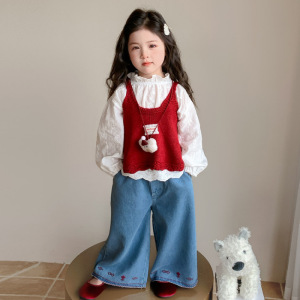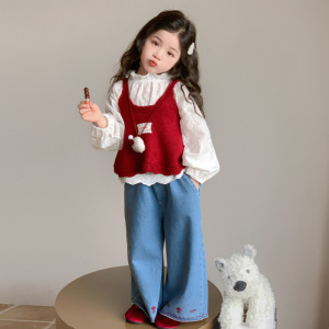 女童套装春秋季2025新款儿童洋气时髦红色马甲女宝宝秋装三件套