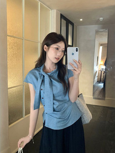 韩系条纹小飞袖飘带短袖衬衫女夏季设计感小衫不规则褶皱收腰上衣