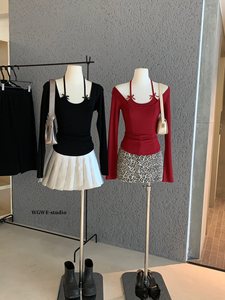 【WGWE】6874早秋新款圆领长袖T恤女设计感吊带假两件上衣打底衫