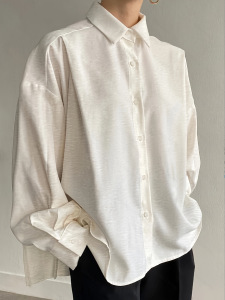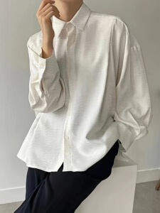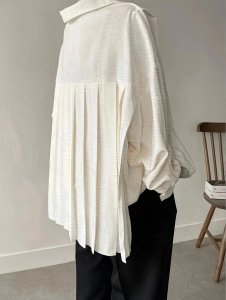 2025年秋跨境ins网红后百褶简约长袖宽松纽扣打褶纯色翻领衬衫女