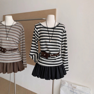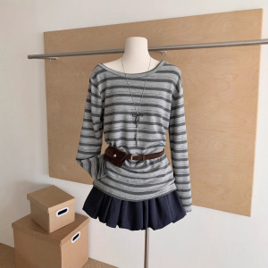 设计感斜领露肩条纹长袖T恤女秋季2025收腰遮肉显瘦百搭上衣