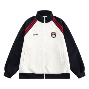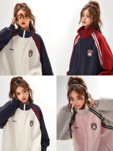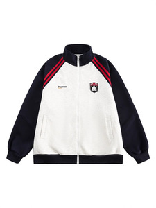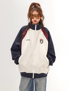 美式复古夹克外套女春秋高级感拼接插肩袖卫衣开衫百搭立领上衣