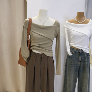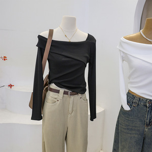 不规则斜领长袖t恤女秋季内搭设计感纯欲风露肩修身显瘦别致上衣