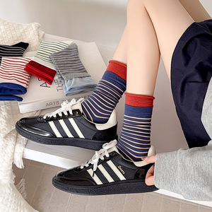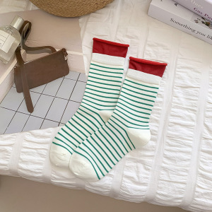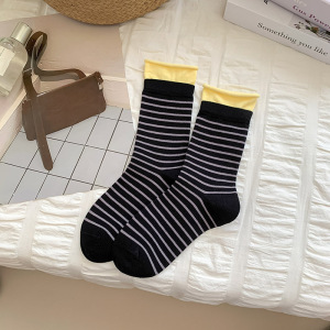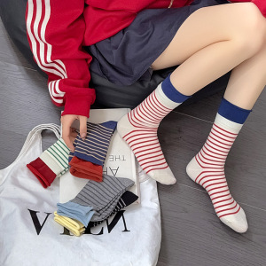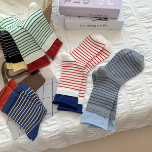 秋冬新款韩国袜子女多巴胺撞色条纹中筒女袜批发双罗口卷边堆堆袜
