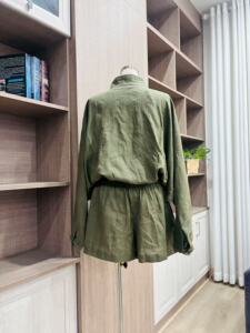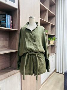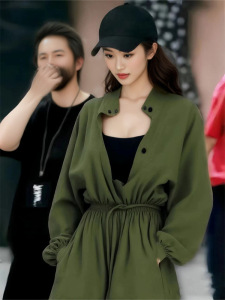 杨幂同款绿色长袖衬衫工装连体裤裙早秋季收腰显瘦阔腿短裤裙套装