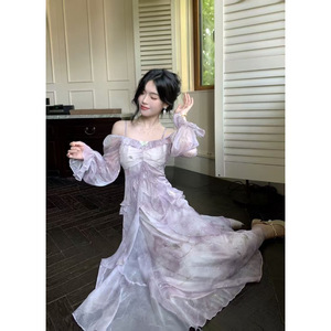 度假风泰国海边旅游气质灰蓝色晕染仙气蝴蝶荷叶边长袖连衣裙
