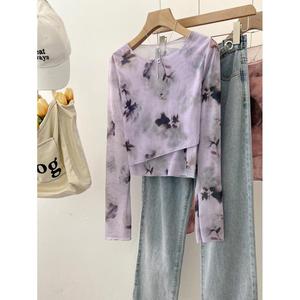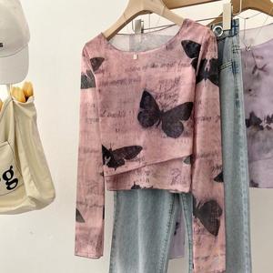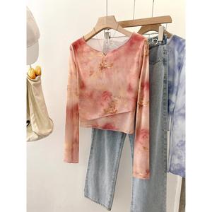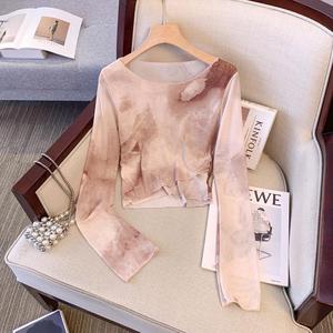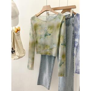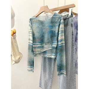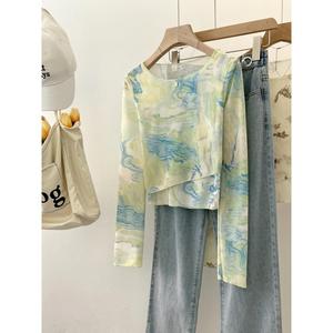 不规则晕染印花网纱长袖恤女夏季新款设计感短款防晒衫罩衫上衣