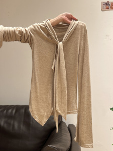 卡其色不规则v领下摆设计感长袖T恤女2025年早秋领带飘带小众上衣
