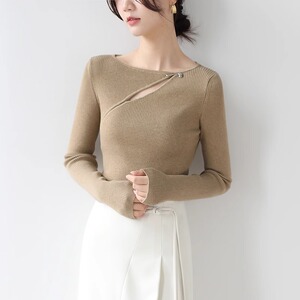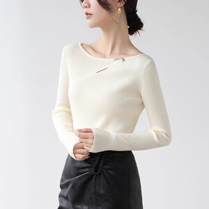 不规则设计感镂空针织衫女2025秋冬金属扣坑条修身打底衫内搭毛衣