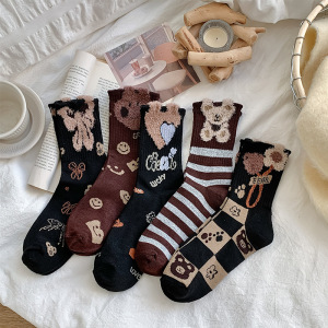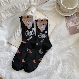 秋冬新款立体花纹羽毛纱中筒袜日系堆堆袜可爱美拉德咖啡色系袜子