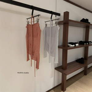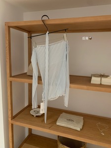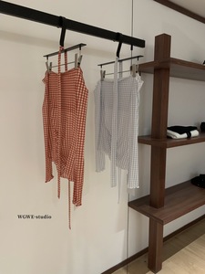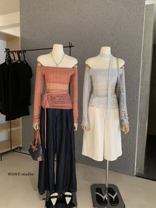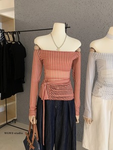 【WGWE】6823韩版显瘦设计感格子网纱一字肩飘带长袖纯欲T恤上衣