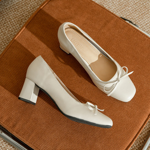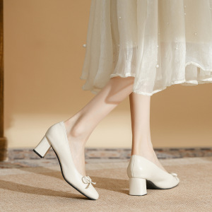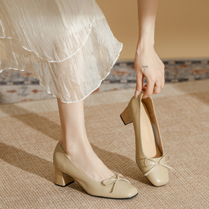 真皮通勤风粗跟低跟单鞋女百搭软皮舒适不累脚工作鞋蝴蝶结高跟鞋