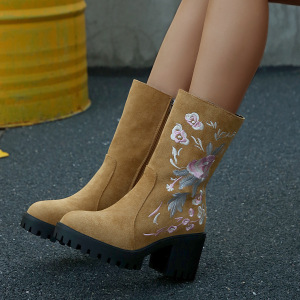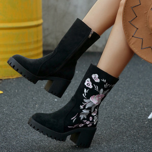2025跨境新款刺绣印花高跟女靴秋冬新款底机车复古厚底马丁靴批发