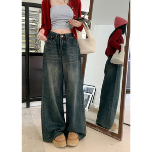 浅色阔腿牛仔裤女秋季复古水洗宽松高腰直筒裤百搭显瘦拖地长裤子